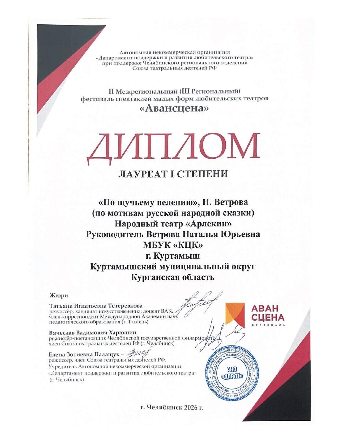 Накануне всемирного Дня Театра наш Народный театр "Арлекин" получил заслуженную награду- Диплом Лауреата 1 степени Межрегионального фестиваля спектаклей малых форм любительских театров "Авансцена" , который проходил при поддержке Челябинского регионального отделения Союза театральных деятелей РФ. #КуртамышскийМО Прикрепления: