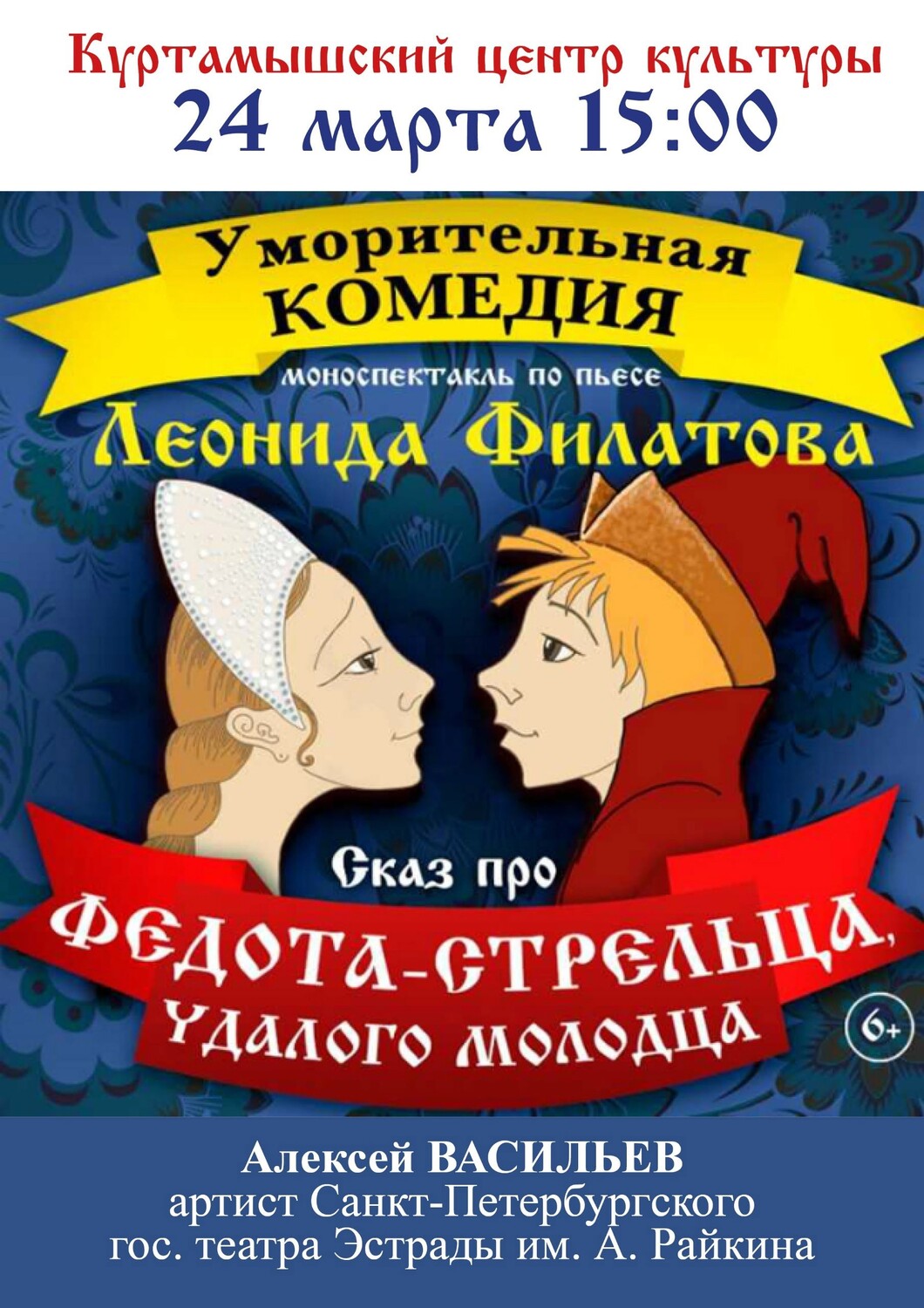 Моноспектакль для взрослых и детей по мотивам самого известного произведения Леонида Филатова «Сказ про Федота-стрельца», завоевавшего популярность благодаря использованию фольклорных персонажей в сочетании с яркой поэтической речью и жесткими сатирическими замечаниями.
