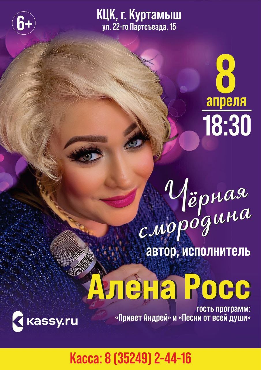 Концерт Алены Росс. В программе «Черная смородина» лауреат Всероссийских фестивалей, обладатель Гран - При в номинации «Автор исполнитель», обладатель престижной премии «Платиновый микрофон», участница программ Андрея Малахова «Привет Андрей» и «Песни от всей души», исполнительница Хита «Черная смородина» Алена Росс.
