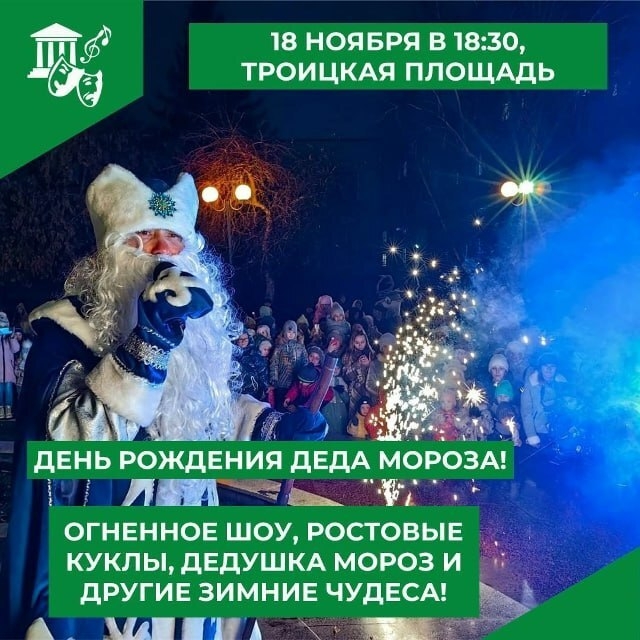 Управление культуры Курганской области приглашает отметить его вместе. 18 ноября Троицкая площадь города Кургана превратится в настоящую сказку! Детей и их родителей ждут на праздновании Дня рождения главного зимнего волшебника — Деда Мороза!