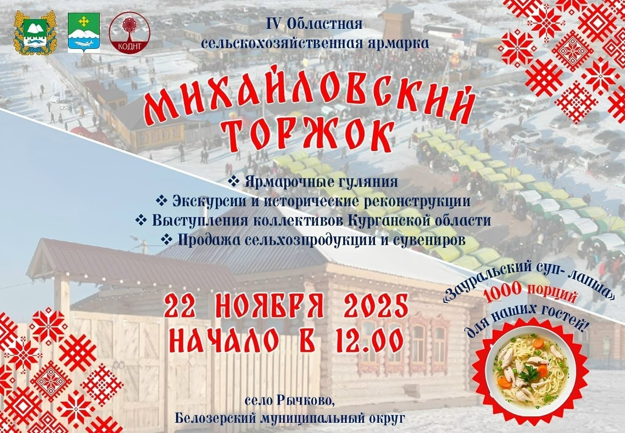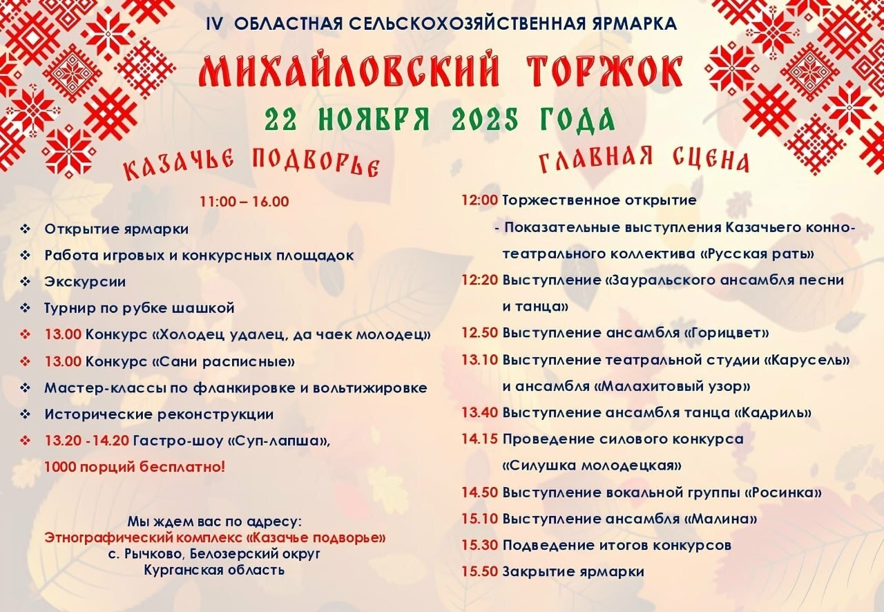 IV Областная сельскохозяйственная ярмарка «Михайловский торжок» пройдет 22 ноября на территории этнографического комплекса «Казачье подворье» в селе Рычково Белозерского округа.