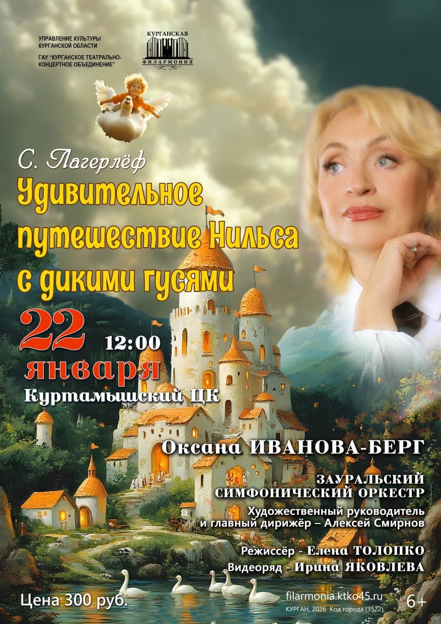 В исполнении солистки Курганской филармонии Оксаны Ивановой-Берг и Зауральского симфонического оркестра прозвучит литературно-музыкальная композиция по мотивам сказки Сельмы Лагерлёф «Удивительное путешествие Нильса с дикими гусями».